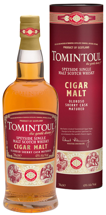 Tomintoul Cigar Malt Single Malt Scotch Whiskey bottle and packaging with sherry cask details.