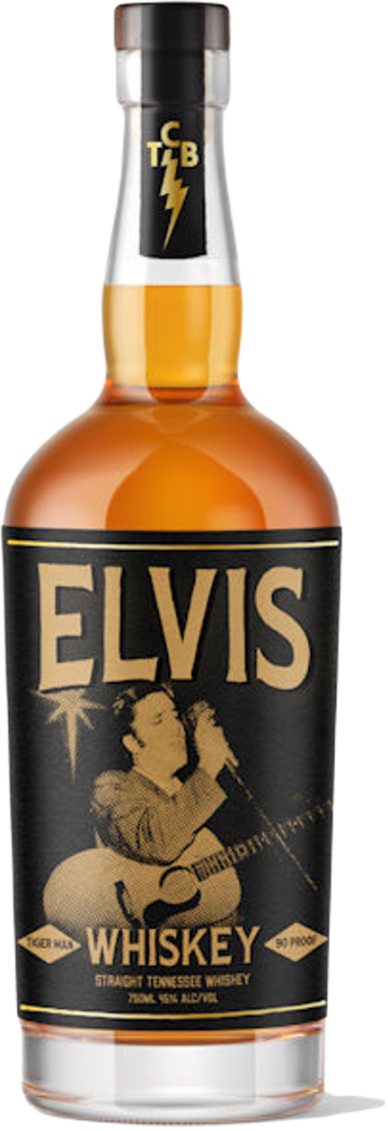 Elvis Tiger Man Straight Tennessee Whiskey 750 ML bottle featuring Elvis Presley-themed label.