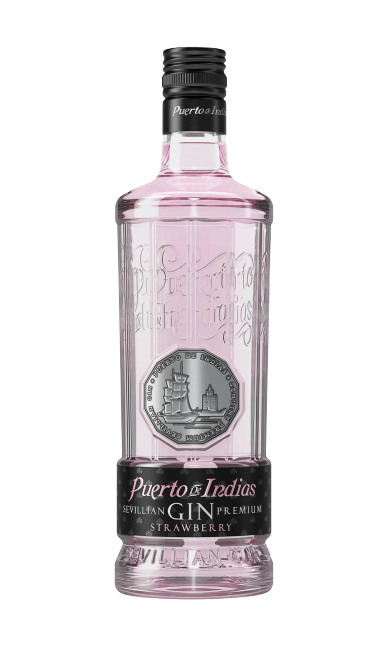 Puerto De Indias Strawberry Flavored Gin Sevillan Premium 750ml bottle with pink hue.
